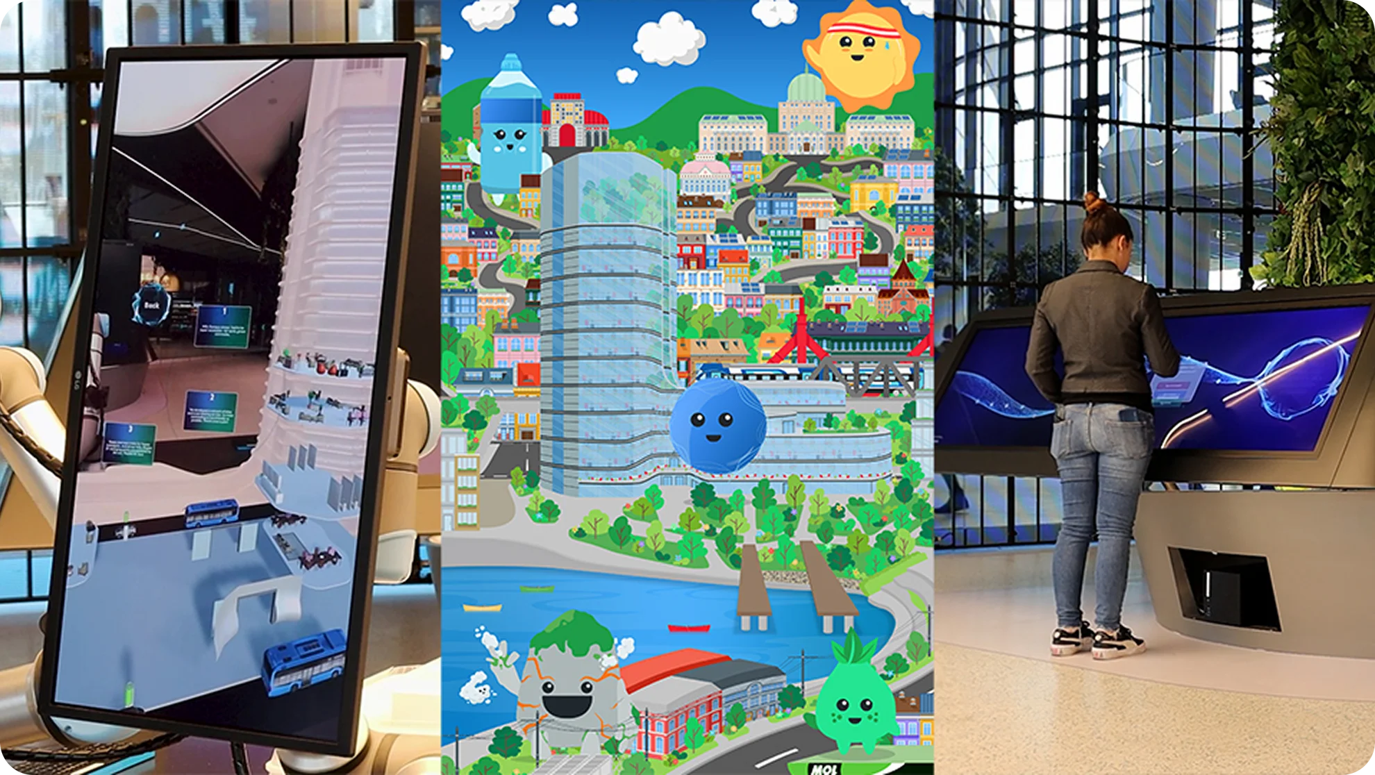 This interactive touchscreen experience encapsulates MOL Group’s vision for the future of energy and mobility. Displayed across 2 x 3-metre ultra-wide, multi-touch LED screens, we blended curated motion graphical content that we created for the overarching brand look and feel, videos, and photography to narrate key strategic areas. Brought together through a beautiful interactive ‘helix’, the shared experience is designed for multiple users to join at any point, with multiple-choice quizzes along the way. A futuristic soundscape complements the thematic shifts in content and subtly emphasises key facts.